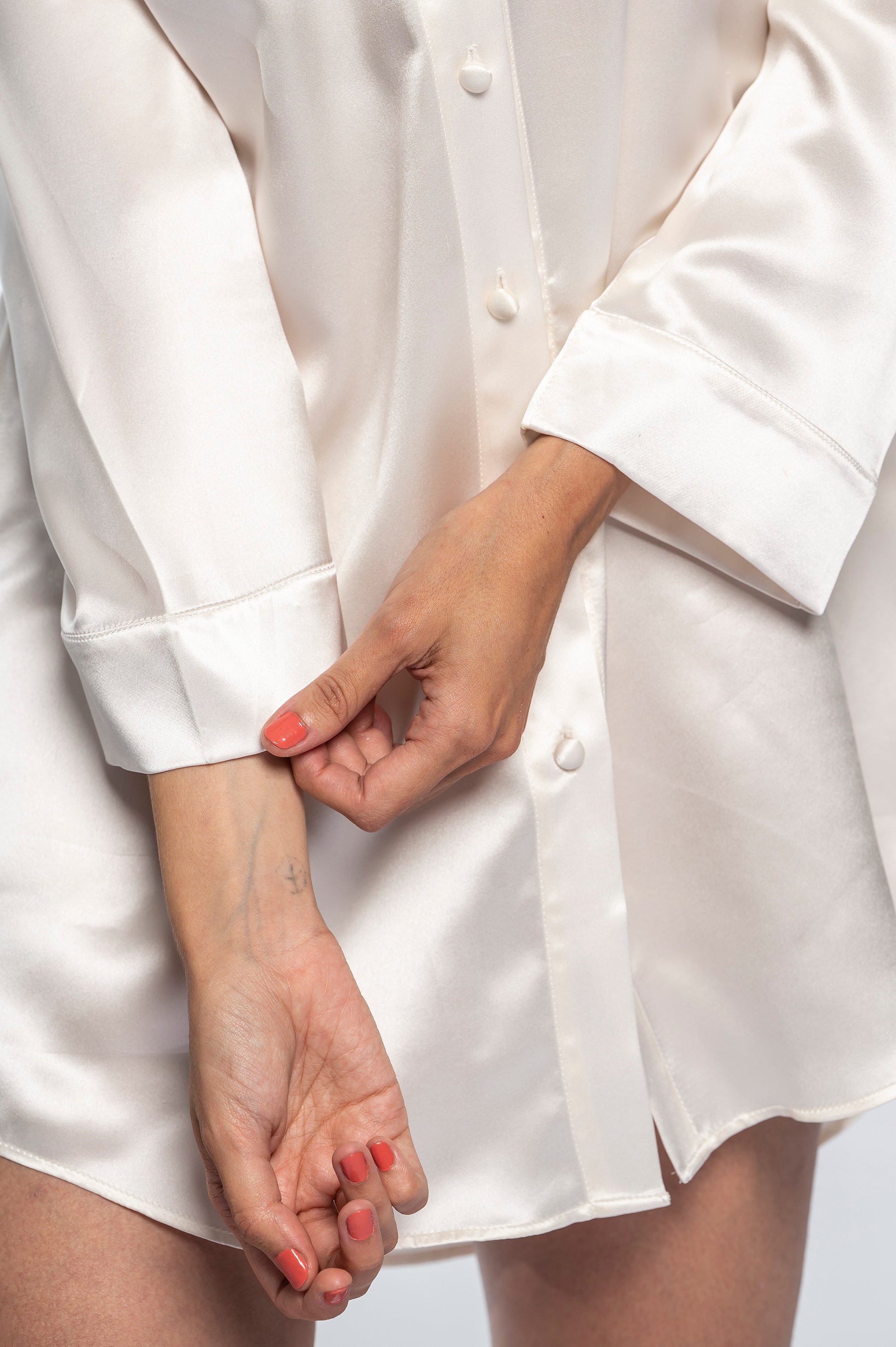 Confeccionado en 100% seda pura, el tejido se desliza sobre la piel con una suavidad incomparable, ofreciendo un brillo natural y un tacto exquisito. El corte tipo oversize proporciona una caída fluida y relajada, invitando al confort sin sacrificar el estilo. Los detalles clásicos como el cuello de solapa y el cierre de botones en el frente le dan un aire atemporal y elegante.