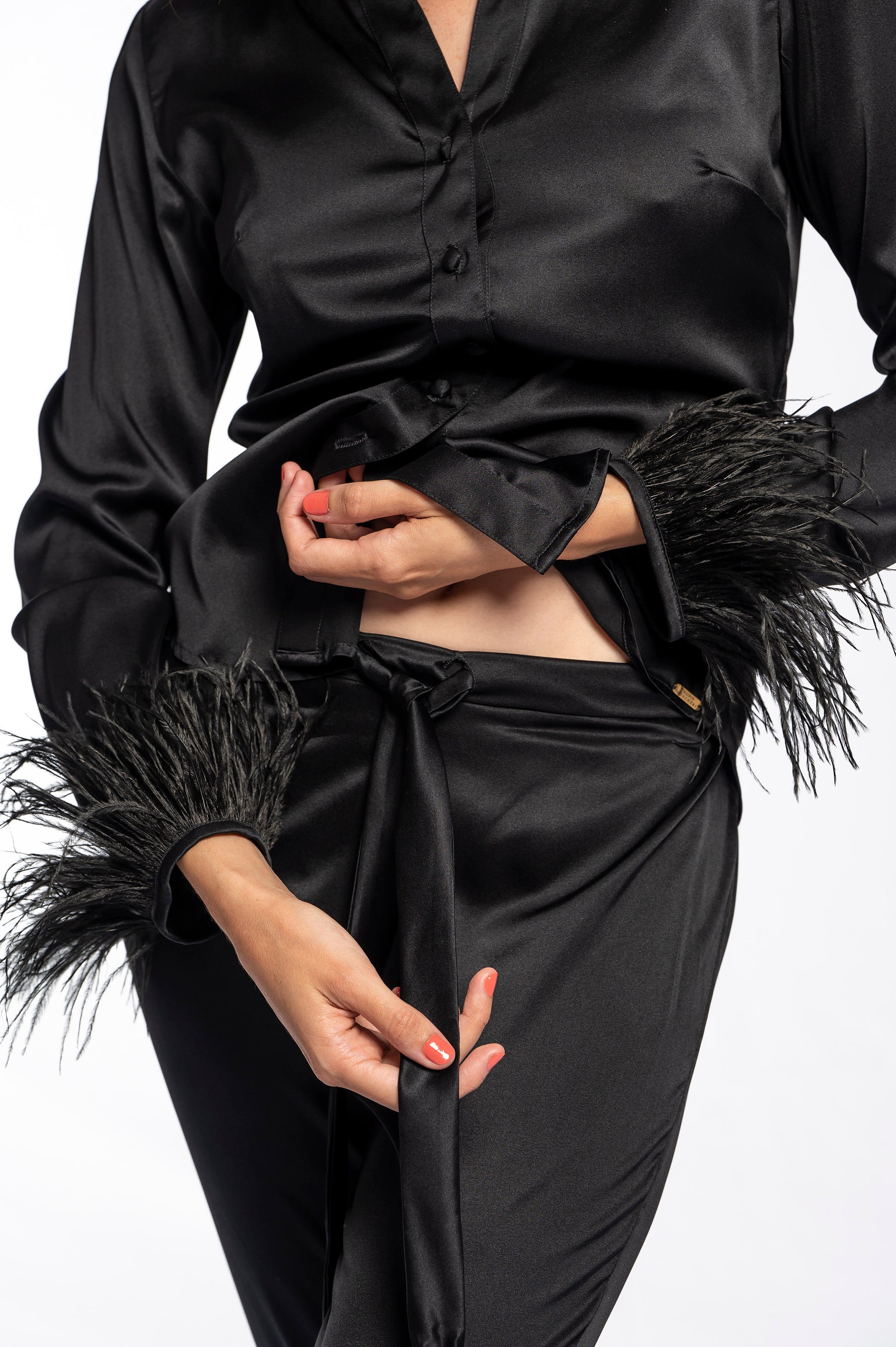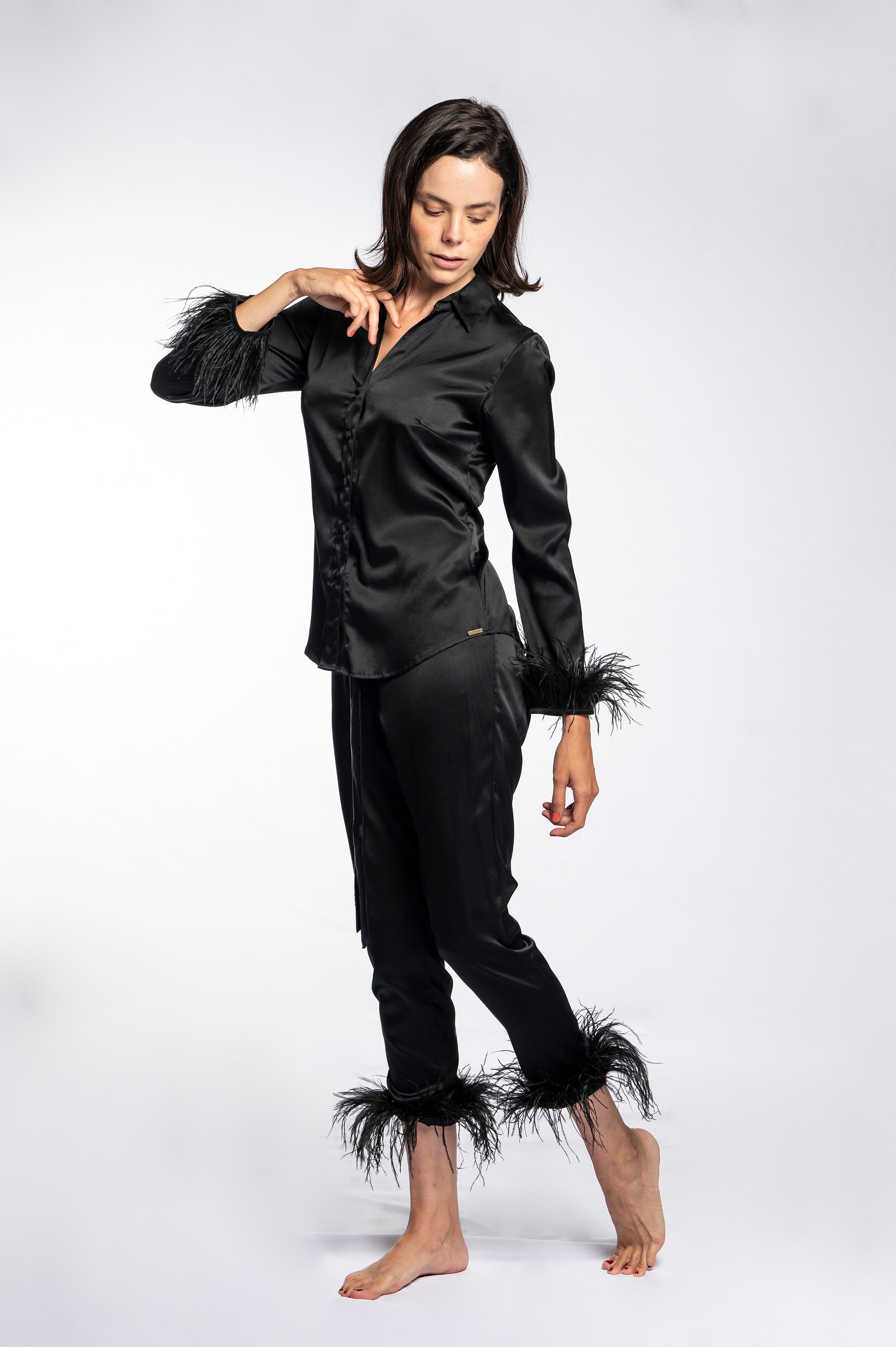 Pijama de dos piezas de seda 95% elastano 5% y plumas de avestruz.